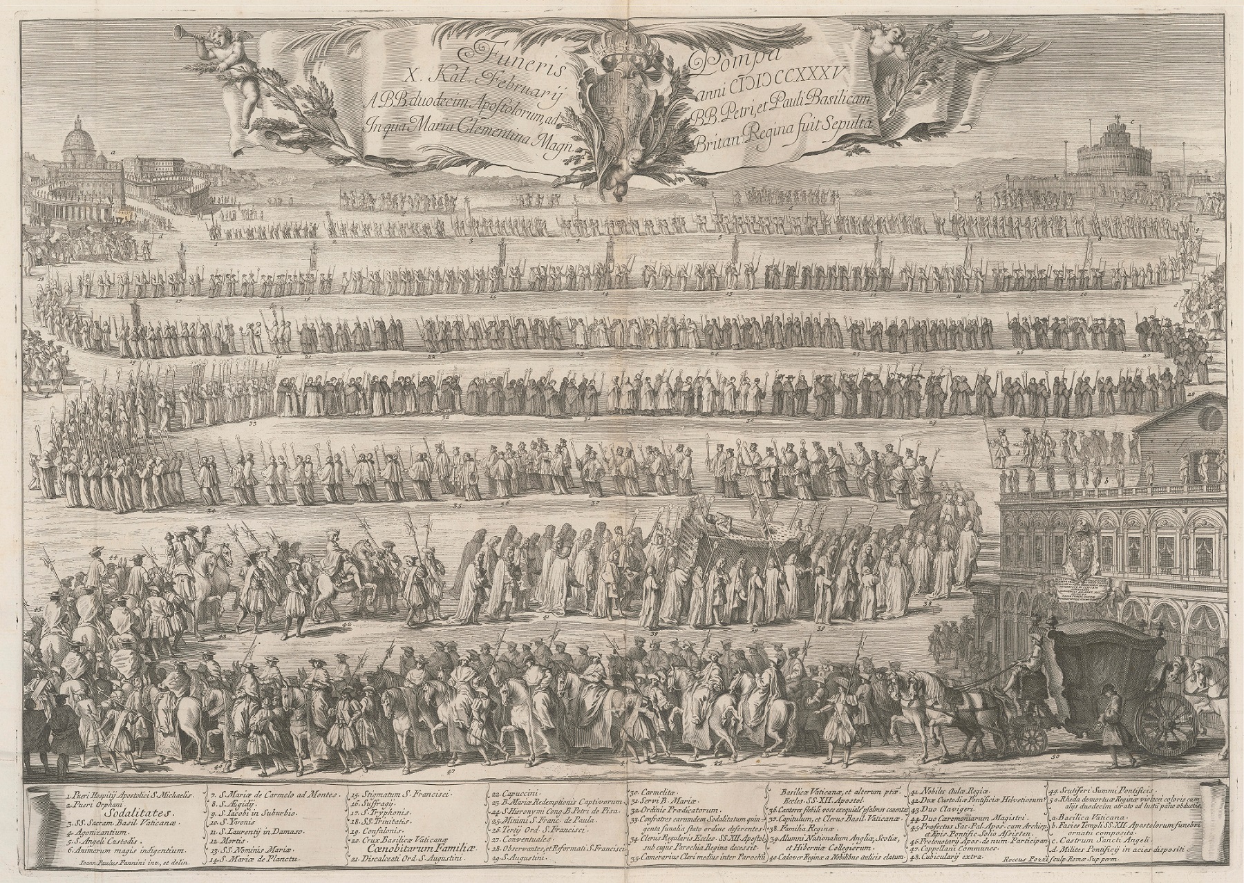 The monument was designed by Filippo Barigioni (1672–1753) and sculpted by Pietro Bracci (1700–1773). The portrait of the queen visible in the finial, made as a mosaic by Pietro Paolo Cristofari (1685–1743), was based on a copy of the portrait of Clementina made by Lodovico Stern in 1740, which is on display at the exhibition. Stern’s work itself was made on the basis of a painting by Martin van Meytens, dating from 1725. Due to the technique used, some details in the mosaic portrait have been simplified. In 1745, Clementina’s body was transferred from a crypt to the basilica and placed in an urn that is part of the monument.