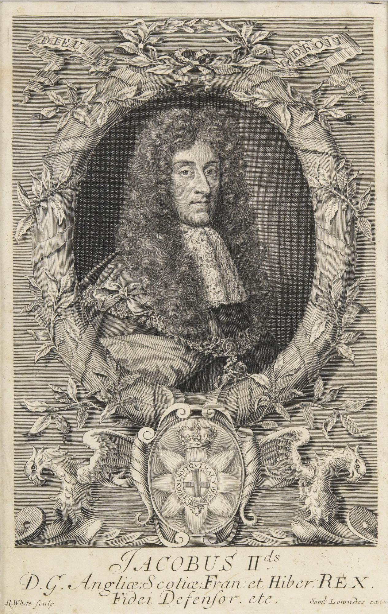 One of many engraved portraits of King James II/VII, which were made during his reign, but also after the outbreak of the ‘Glorious Revolution’, as a result of which he was deposed and had to flee to the France. This engraving features a bust of the king in an oval, decorative frame. Below the image is a shield with the emblem of the Order of the Garter, with the motto of the order: HONI SOIT QUI MAL Y PENSE—shame on anyone who thinks ill of it.