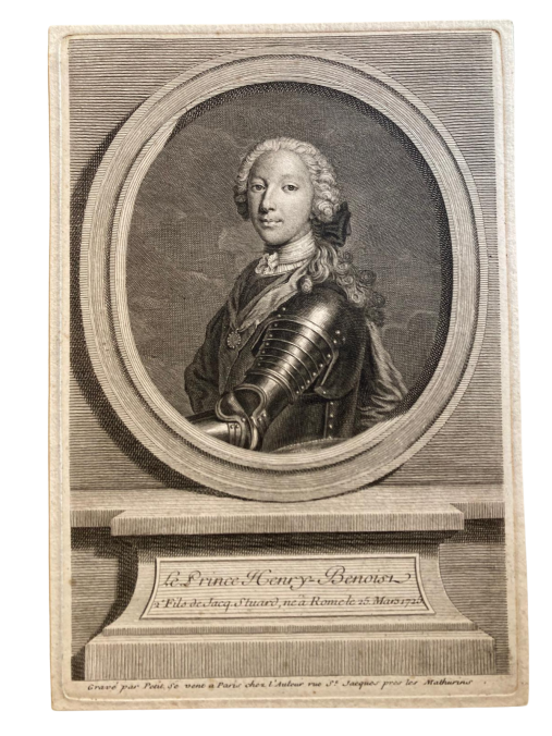 The portraits of the sons of the two princes are after originals by Domenico Duprà (1689–1770), who studied in Rome under Francesco Trevisani and then worked for the courts of the King of Portugal in Lisbon and of the King of Sardinia in Turin. All three original portraits were sent from Rome to be engraved in Paris. The inscription below Charles’ portrait states that the original belonged to Mr. d’Obryen. Daniel O’Brien was for many years King James’ agent in Paris. He joined the court in Rome in 1747 as one of the king’s ministers and was created Earl of Lismore.