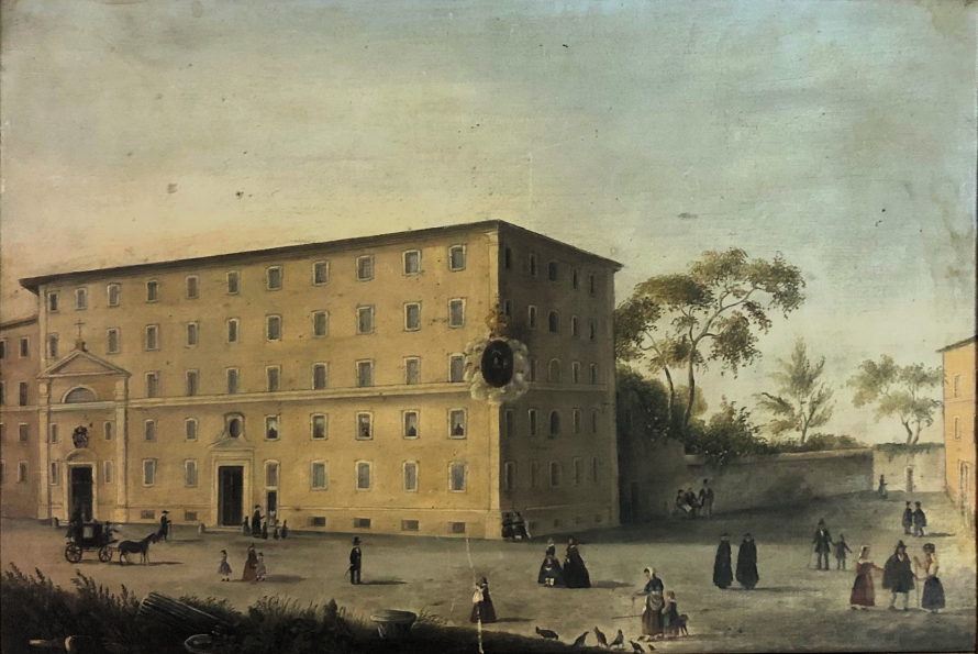 Obraz niedawno odnaleziony w klasztorze urszulanek – pierwotnie pochodzący z klasztoru przy Via Vittoria – przedstawia, jak wyglądała fasada klasztoru w połowie XIX wieku (ryc. 4). Pewne prace renowacyjne przeprowadzili architekci Mauro Fontana i Pietro Camporese w połowie XVIII wieku, lecz zdają się one dotyczyć głównie krużganka[23][21], więc możemy sobie wyobrazić, że fasada wyglądała mniej więcej tak samo w czasach Klementyny. Obraz, niepodpisany, ma na odwrocie notę wyjaśniającą, że był darem Bianki Lorenzany dla jej ciotki, siostry Marii Nazareny Lorenzany, i nosi datę 23 października 1860. Malowidło zdradza znajomość zasad klasycznego malarstwa pejzażowego, choć oddanych w formie uproszczonej. Prosta architektura pejzażowa ujęta jest w rząd drzew i uzupełniona niewielkimi postaciami na pierwszym planie, oddalającymi się ku horyzontowi. Przedstawiona struktura architektoniczna jest do dziś rozpoznawalna: drzwi wejściowe z trójkątnym tympanonem zwieńczone są okrągłym oknem ozdobionym wolutami i nakrytym małym przyczółkiem z pełnym łukiem w centrum; dalej na prawo widzimy wejście do kościoła pw. świętych Józefa i Urszuli, gdzie Maria Klementyna zwykła udawać się na modlitwę. Portal ujęty jest dwoma wysokimi pilastrami sięgającymi trzeciej kondygnacji okien, ponad gzymsem. Przyczółek portalu jest osiowy, podczas gdy bardziej monumentalny przyczółek łączący pilastry ma formę trójkątną. Do dziś możemy dostrzec owalną kapliczkę na rogu Vicolo delle Orsoline, obecnie pozbawioną obrazu i korony, które w naszym obrazie zostały uwypuklone, być może w sposób idealizowany. Na podstawie dedykacji na odwrocie możemy przypuszczać, że obraz został namalowany przez siostrzenicę urszulanki. Nie było rzeczą rzadką, że w edukacji młodych dziewcząt w tym czasie przewidywano lekcje malarstwa. Dziewczęta otrzymywały wykształcenie kładące nacisk na sztuki uznawane za stosowne dla ich „płci”, takie jak haft, rysunek, malarstwo i muzyka, aby rozwijać wdzięk, ogładę i dobre maniery[24].