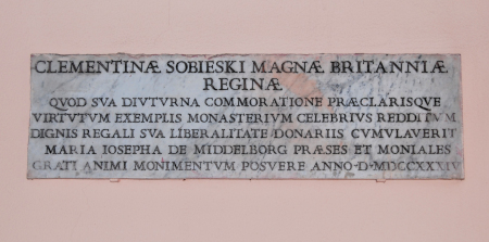 CLEMENTINAE SOBIESKI MAGNAE BRITANNIAE | REGINAE | QVOD SVA DIVTVRNA COMMORATIONE PRAECLARISQUE | VIRTVTVM EXEMPLIS MONASTERIVM CELEBRIVS REDDITVM | DIGNIS REGALI SVA LIBERALITATE DONARIIS CVMVLAVERIT | MARIA IOSEPHA DE MIDDELBORG PRAESES ET MONIALES | GRATI ANIMI MONIMENTUM POSVERE ANNO – D – MDCCXXXIV[15].